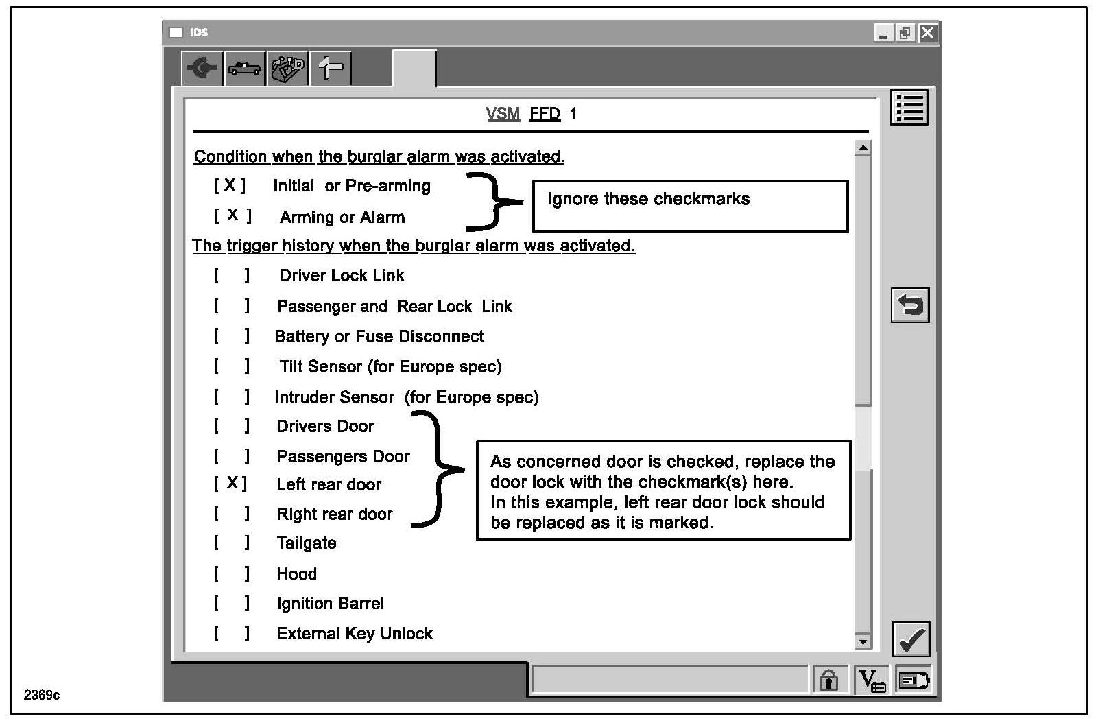8. After replacing the door lock(s), clear the freeze frame data of ~he trigger history when the burglar alarm was activated" according to MS3 online instructions or the Workshop Manual (section 09-14 THEFT-DETERRENT SYSTEM CLEARING FREEZE FRAME DATA).