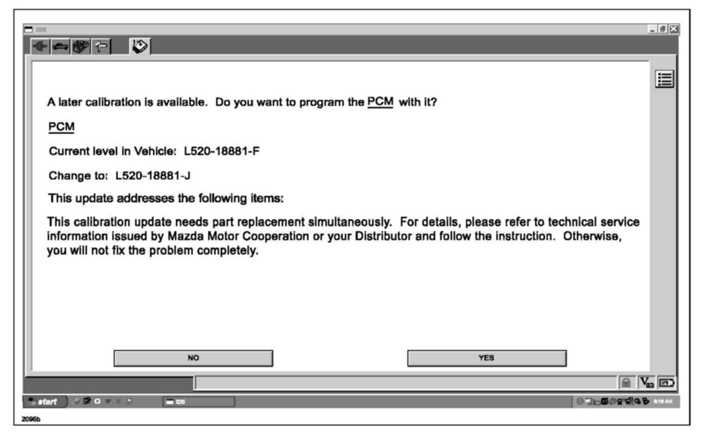 When performing a PCM reprogramming on a vehicle built before Oct. 17, 2008 (without a diode), the (example only shown) screen may appear in the Mazda Modular Diagnostic System (M-MDS).