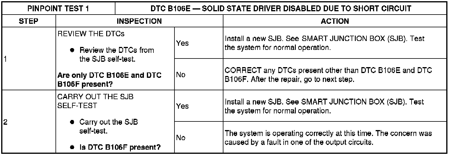PINPOINT TEST 1: DTC B106E - SOLID STATE DRIVER DISABLED DUE TO SHORT CIRCUIT