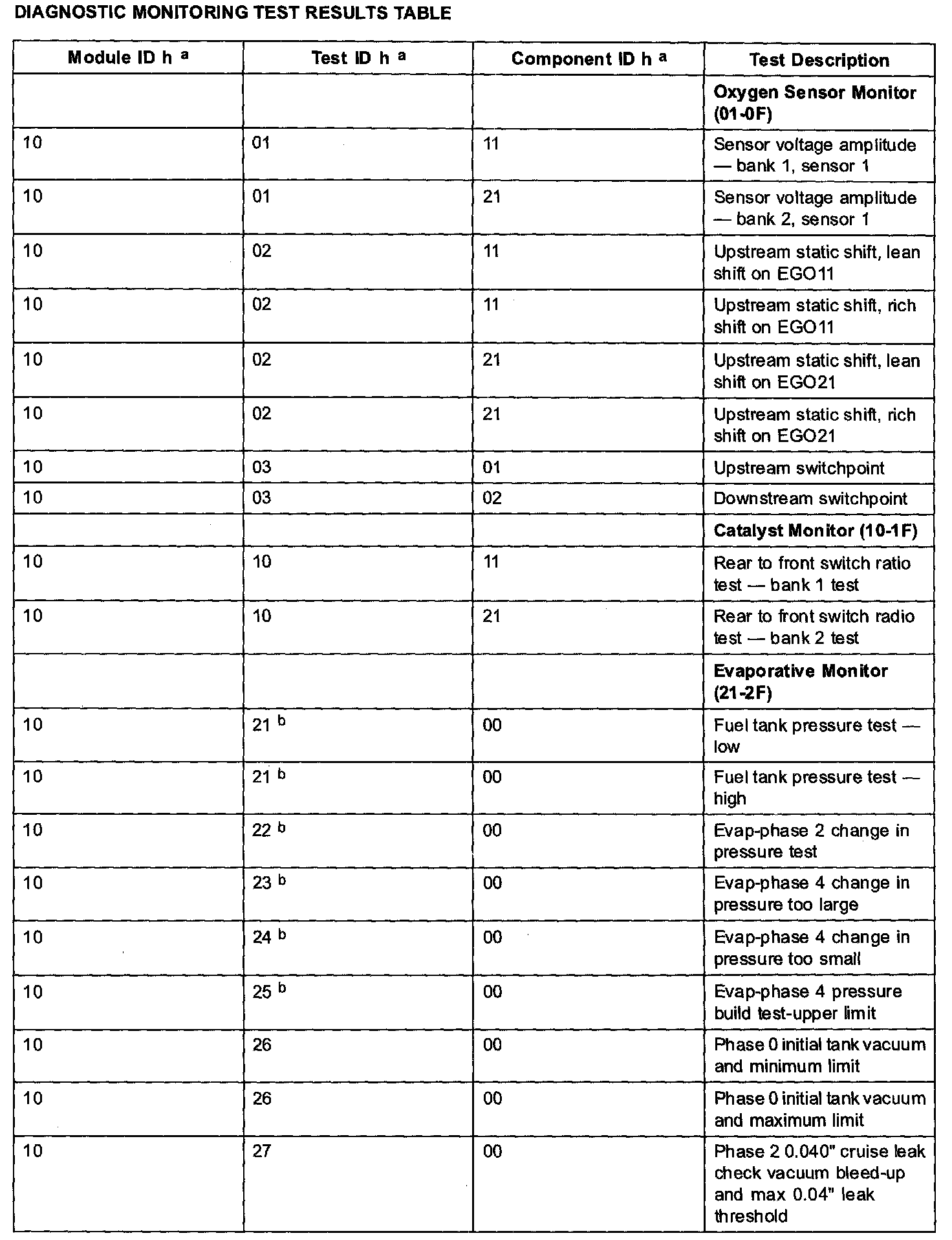 Diagnostic Monitoring Test ResultsThe purpose of this test mode is to allow access to the results of OBD II monitor diagnostic test results. The test values that are stored at the time of the particular monitor completion are displayed when the particular test identification is requested. See the table for test information.