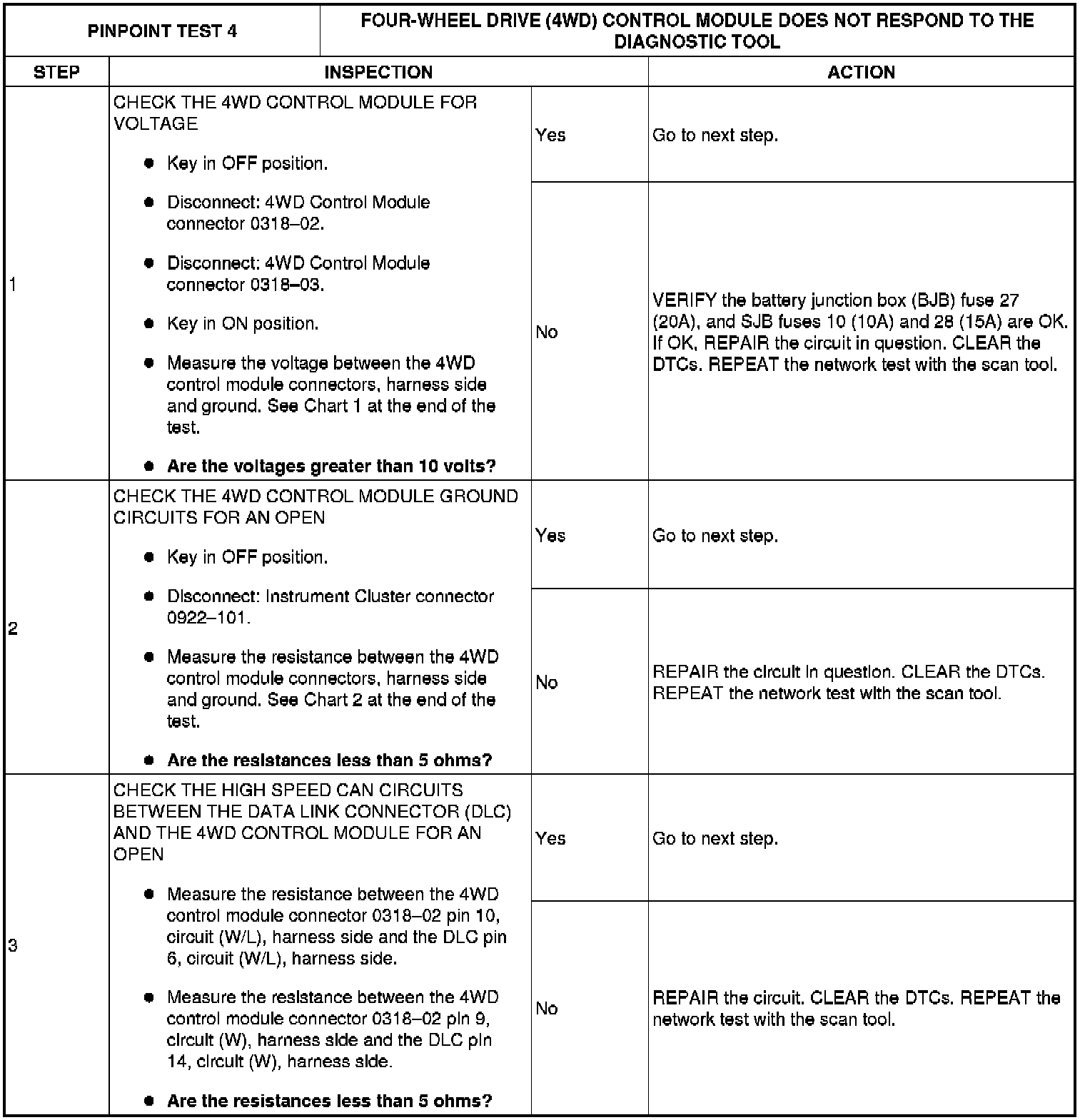 Pinpoint Test 4: Four-Wheel Drive (4WD) Control Module Does Not Respond To The Diagnostic Tool