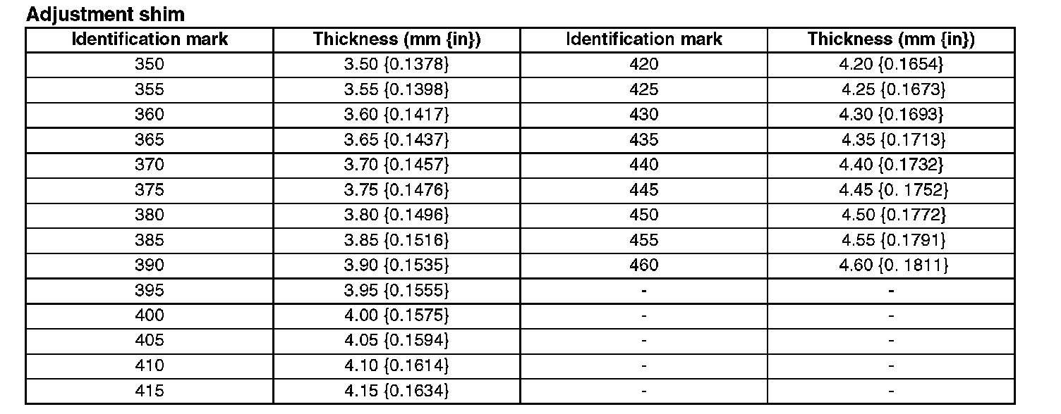 10. If the thickness of the installed adjustment shim is not within the C range, select the appropriate adjustment shim from the table below and use it.
