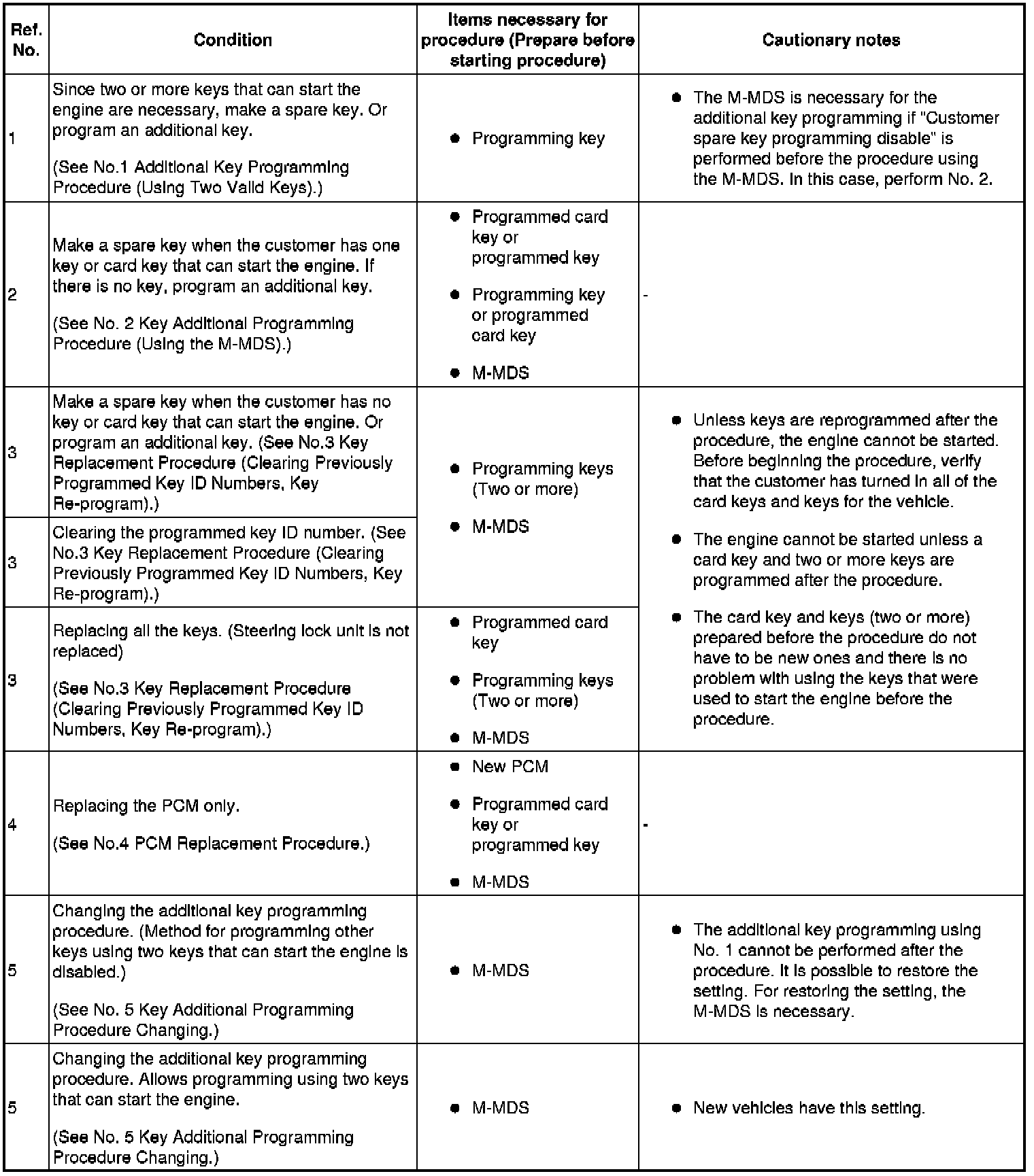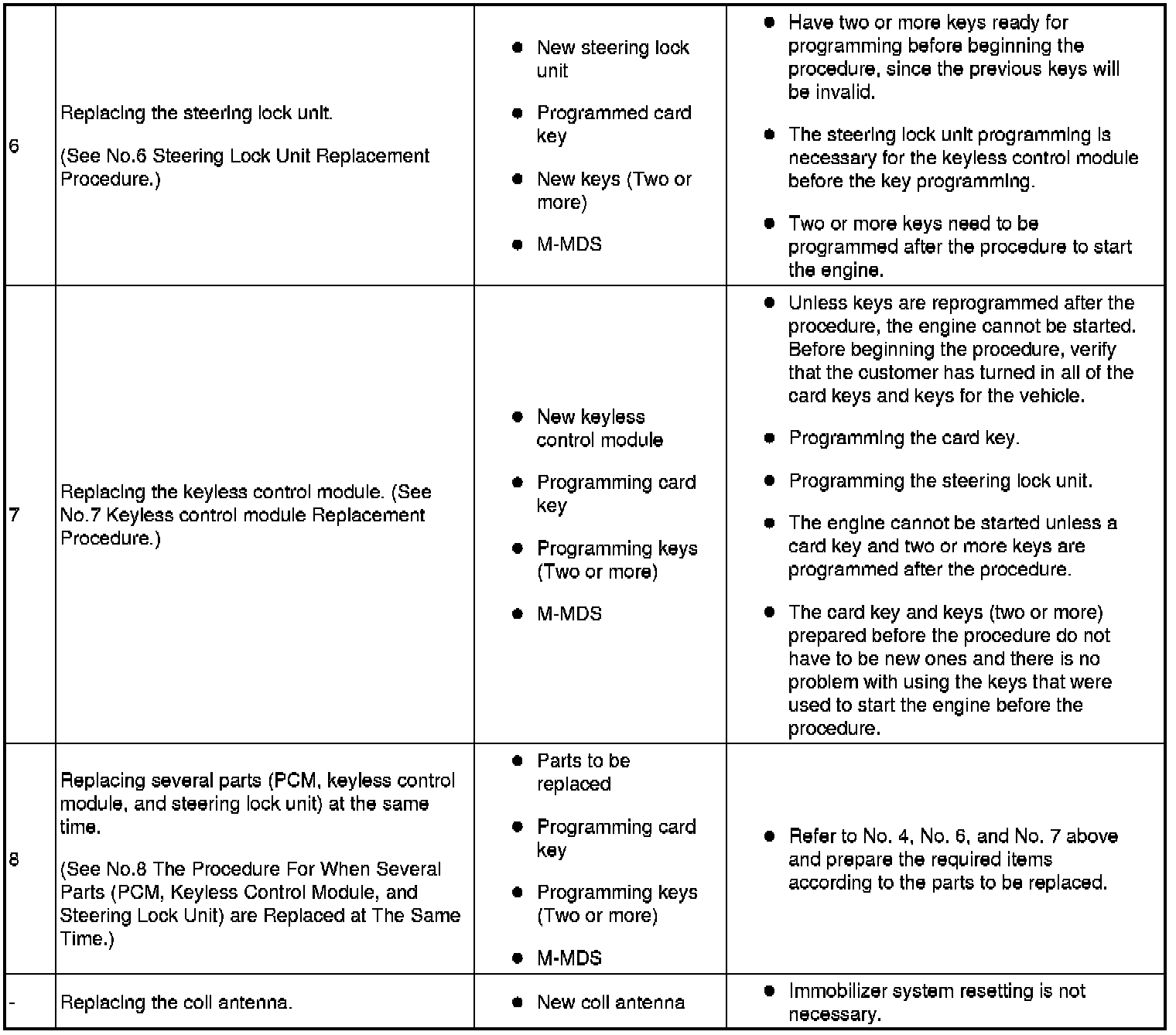 - When performing the following procedures, the immobilizer resetting procedure using the M-MDS must also always be performed: "Keyless control module replacement", "PCM replacement", "Steering lock unit replacement", and "Key ID number clearing". The engine will not start unless all work is performed using the M-MDS.