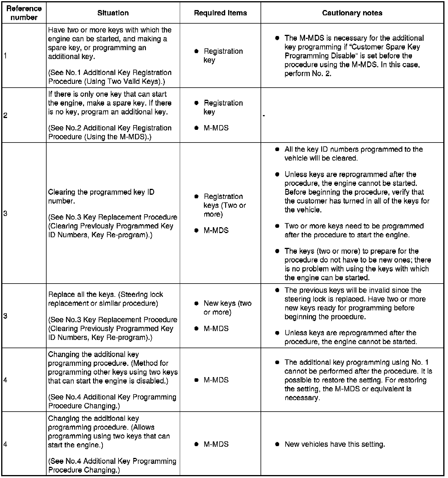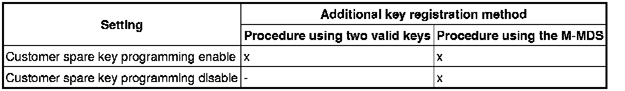 - If "No. 1 Additional Key Programming Procedure (Using Two Valid Keys)" is set to disable, the additional key programming can be only performed using the M-MDS preventing the forging of a spare key by using two valid keys. This function is for use by rental car agencies or other companies with vehicle fleets.