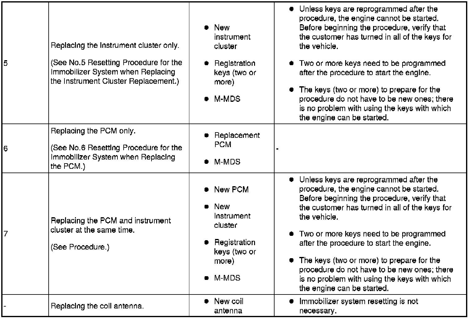 - The immobilizer resetting procedure using the M-MDS must also always be performed when performing the following procedure: "instrument cluster replacement", "PCM replacement", "instrument cluster and PCM joint replacement", and "key ID number clearing". The engine will not start unless all work is performed using the M-MDS.