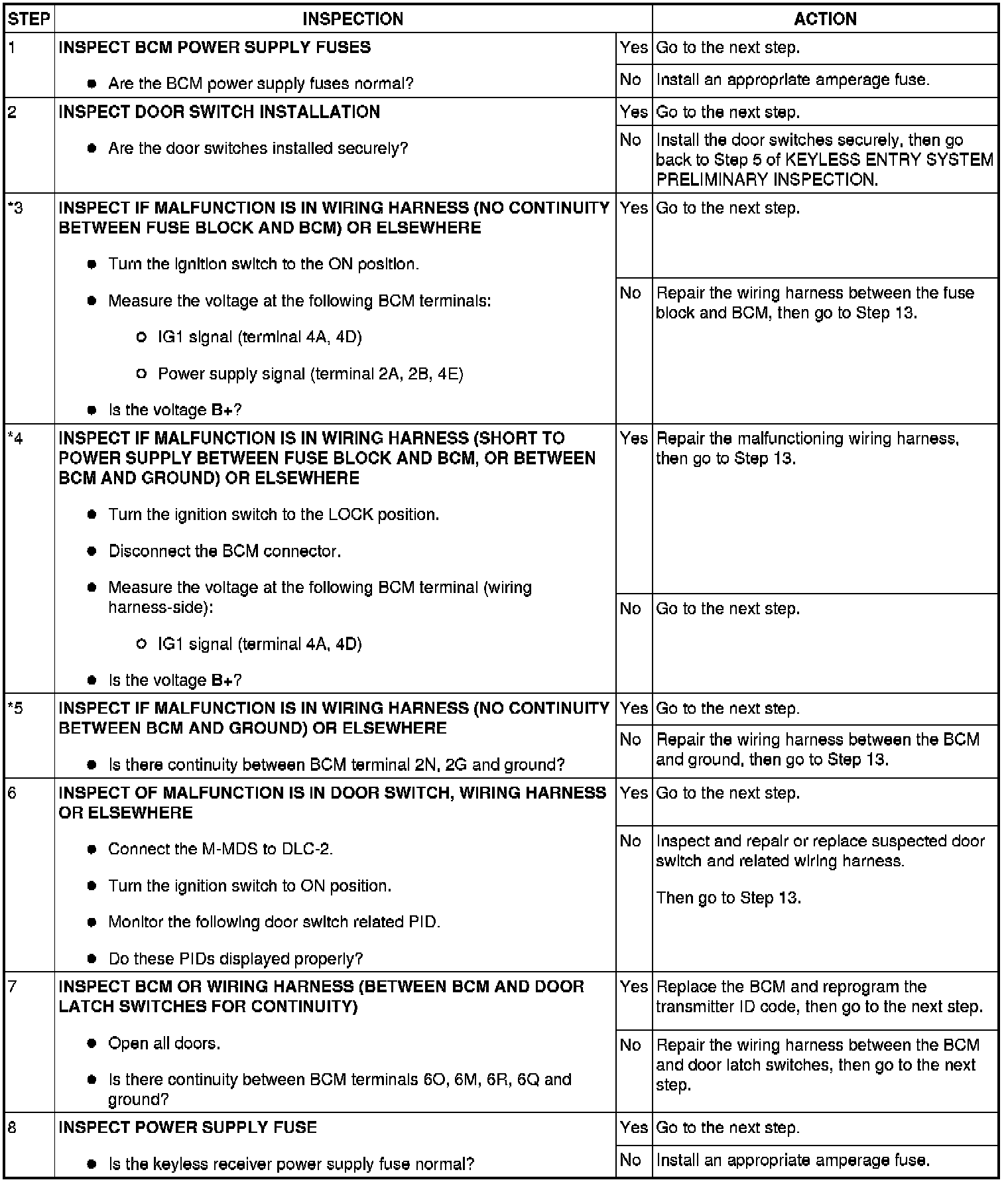 - When performing an asterisked (*) troubleshooting inspection, slightly shake the wiring harness and connectors while performing the inspection to discover whether poor contact points are the cause of any intermittent malfunctions. If there is a problem, verify that the connectors, terminals and wiring harnesses are connected correctly and undamaged.