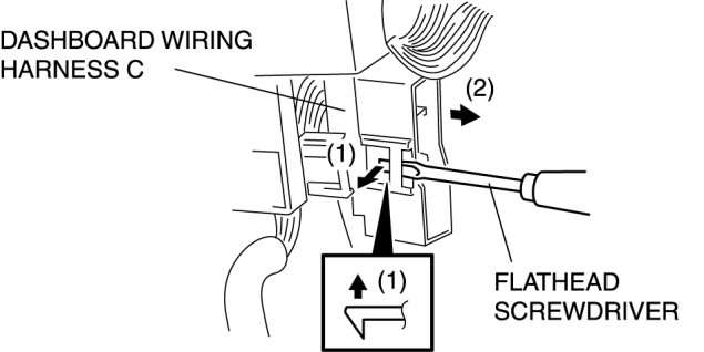 1. As shown in the figure, lift the tab in the direction of the arrow (1) using a tape-wrapped flathead screwdriver, and while keeping it lifted, pull it in the direction of the arrow (2) to remove.