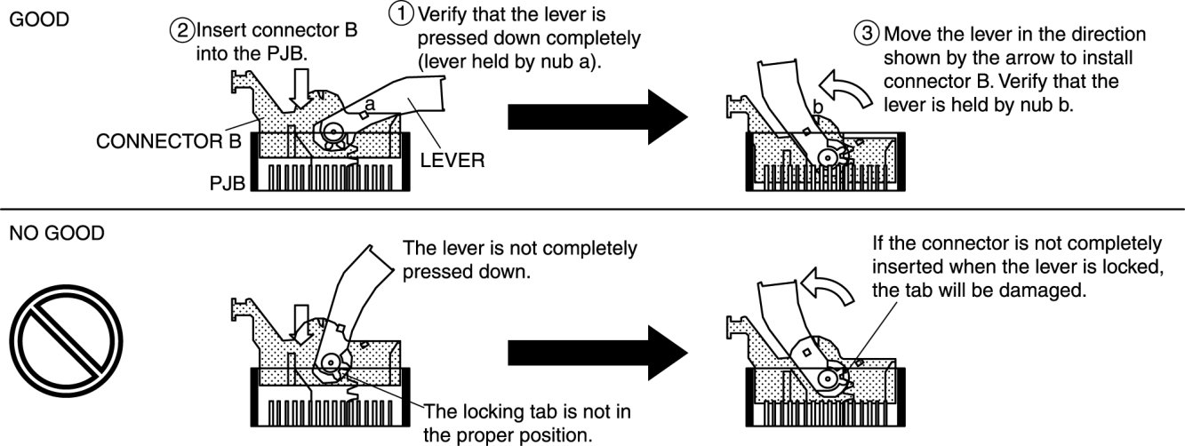 1. Rotate the lever in the direction of the arrow and remove connector B
