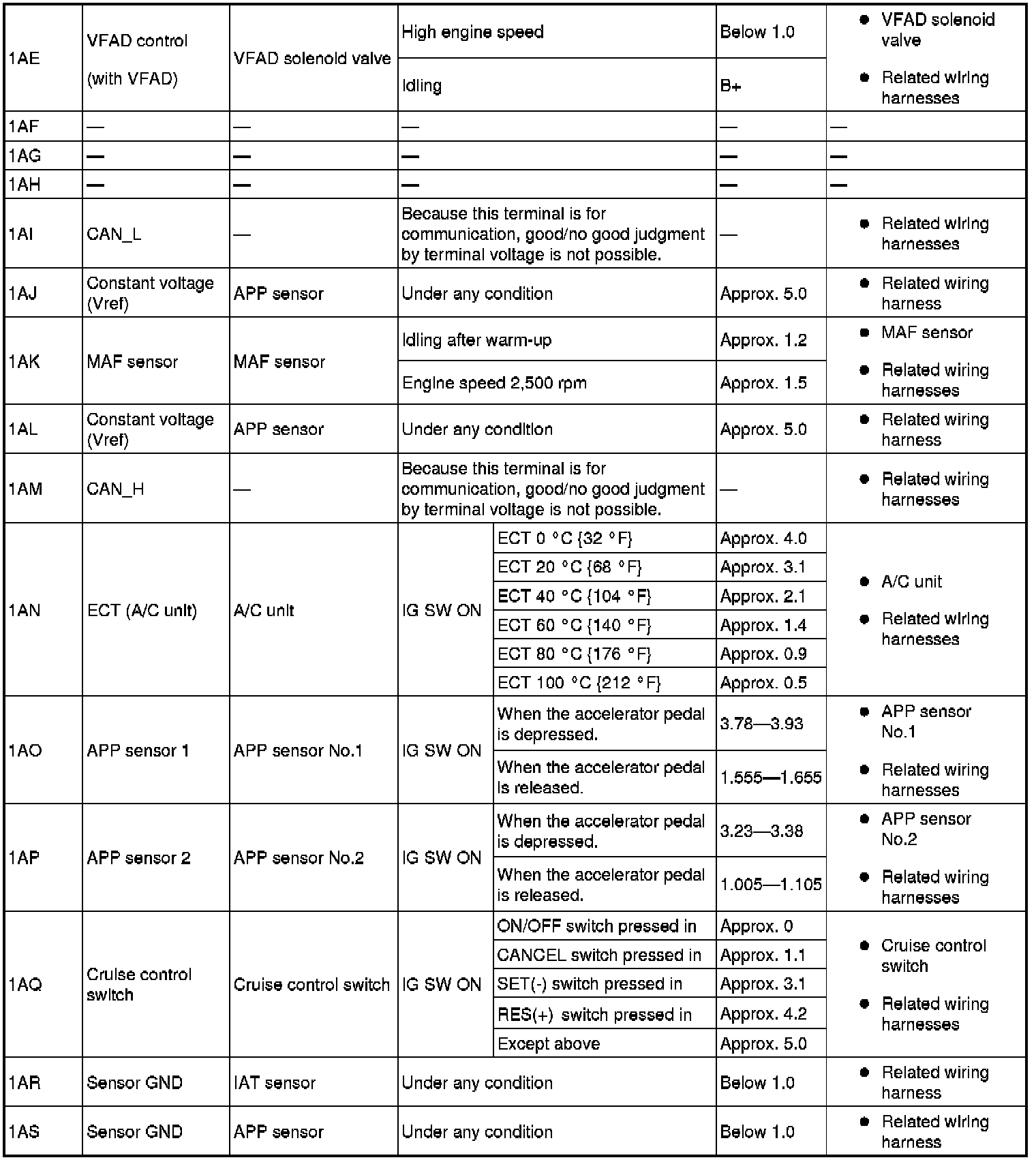 - The PCM terminal voltages vary with change in measuring conditions and vehicle conditions. Always carry out a total inspection of the input systems, output systems, and PCM to determine the cause of trouble. Otherwise, a wrong diagnosis will be made.