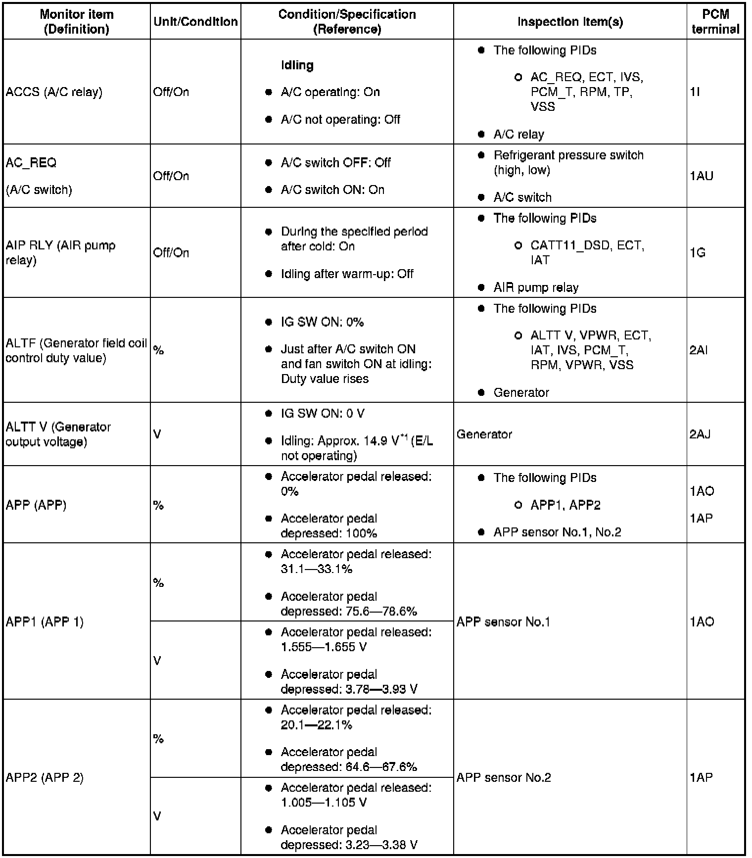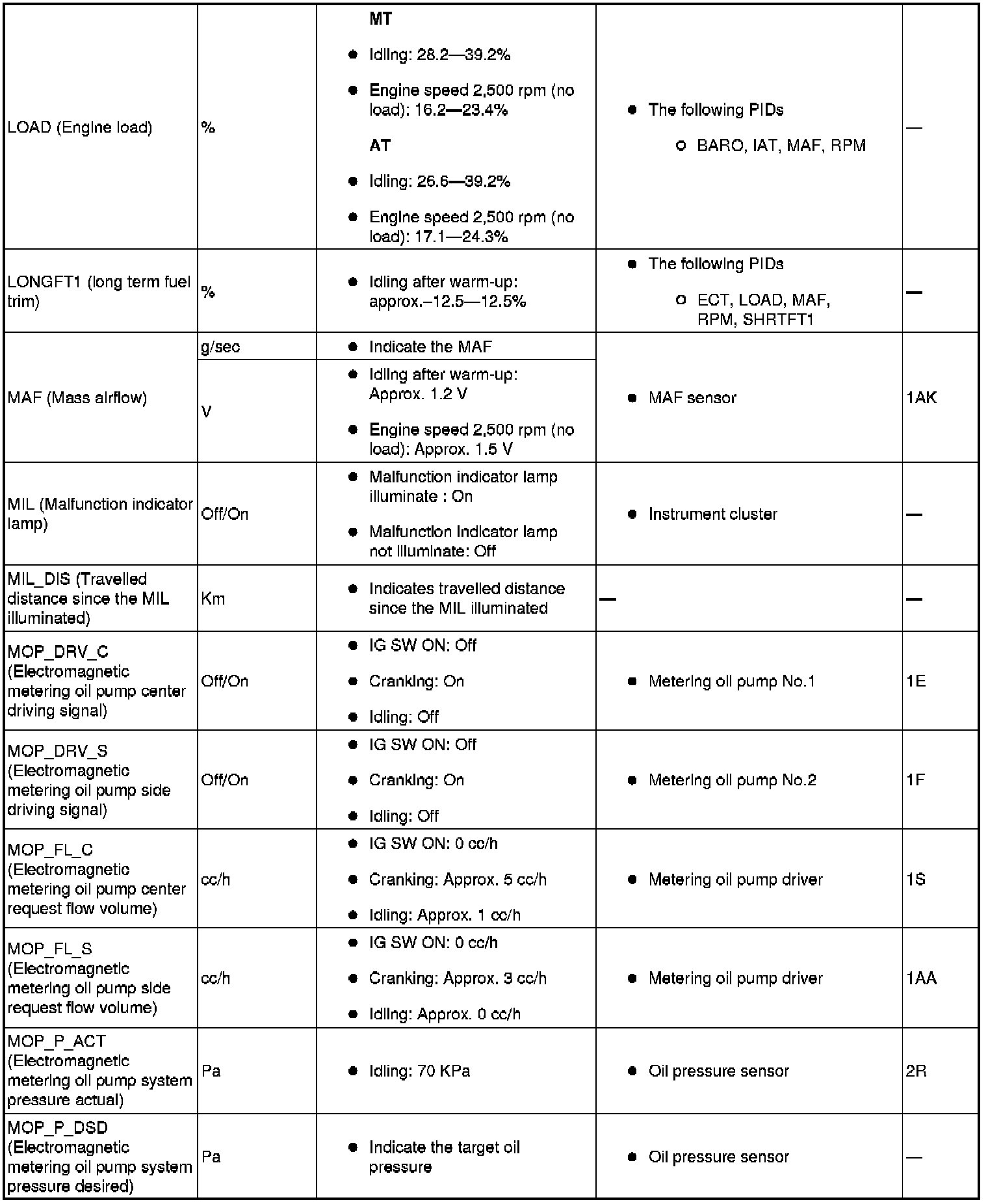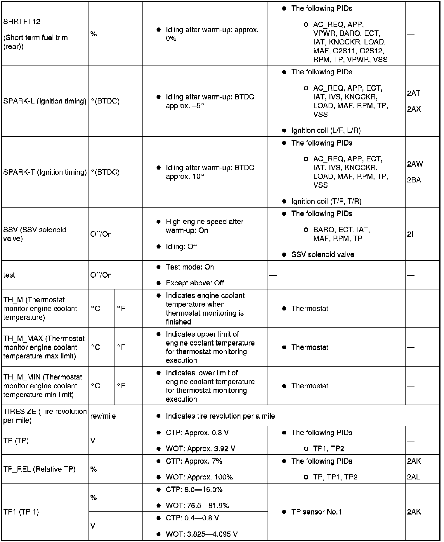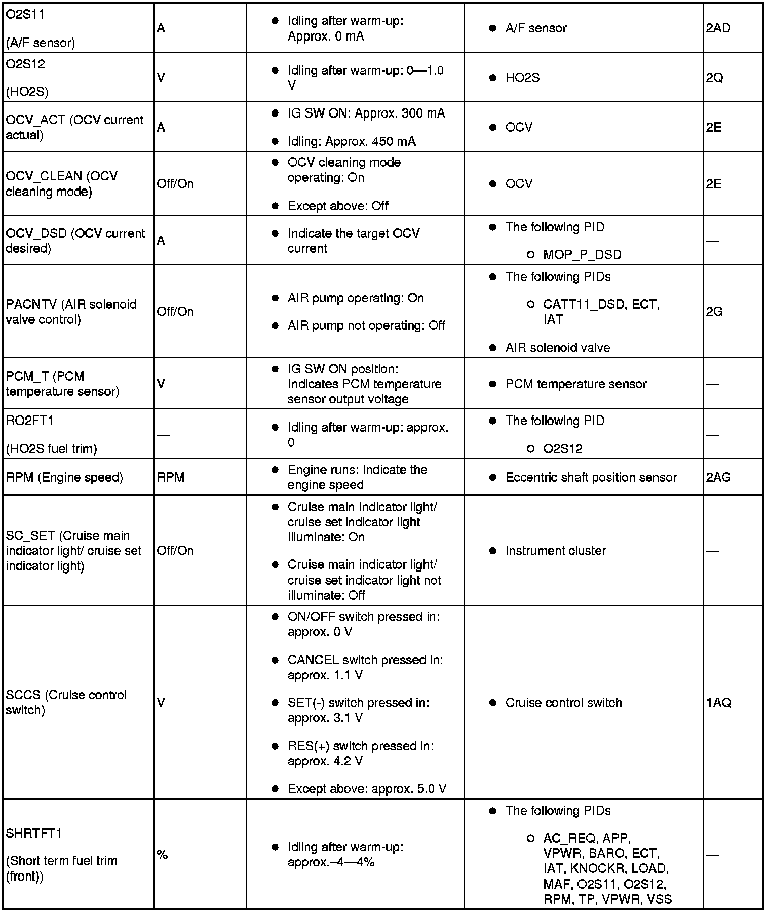 Home >> Mazda >> 2009 >> RX8 2RTR-1.3L >> Repair and Diagnosis >> Powertrain Management >> Computers and Control Systems >> Engine Control Module >> Testing and Inspection >> Pinout Values and Diagnostic Parameters >> PID/DATA Monitor Table
