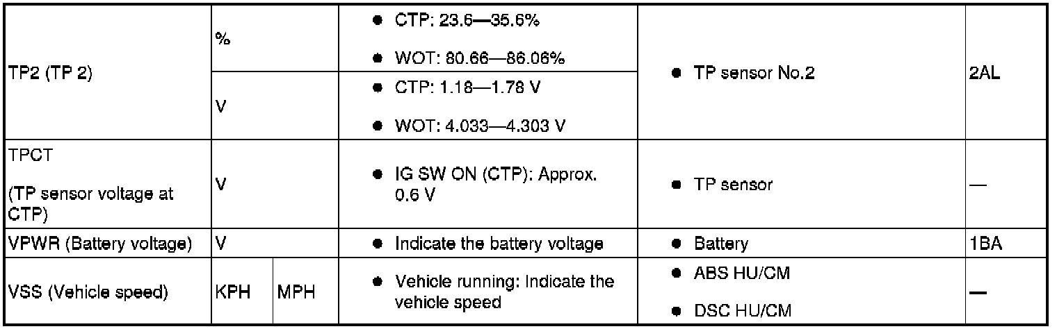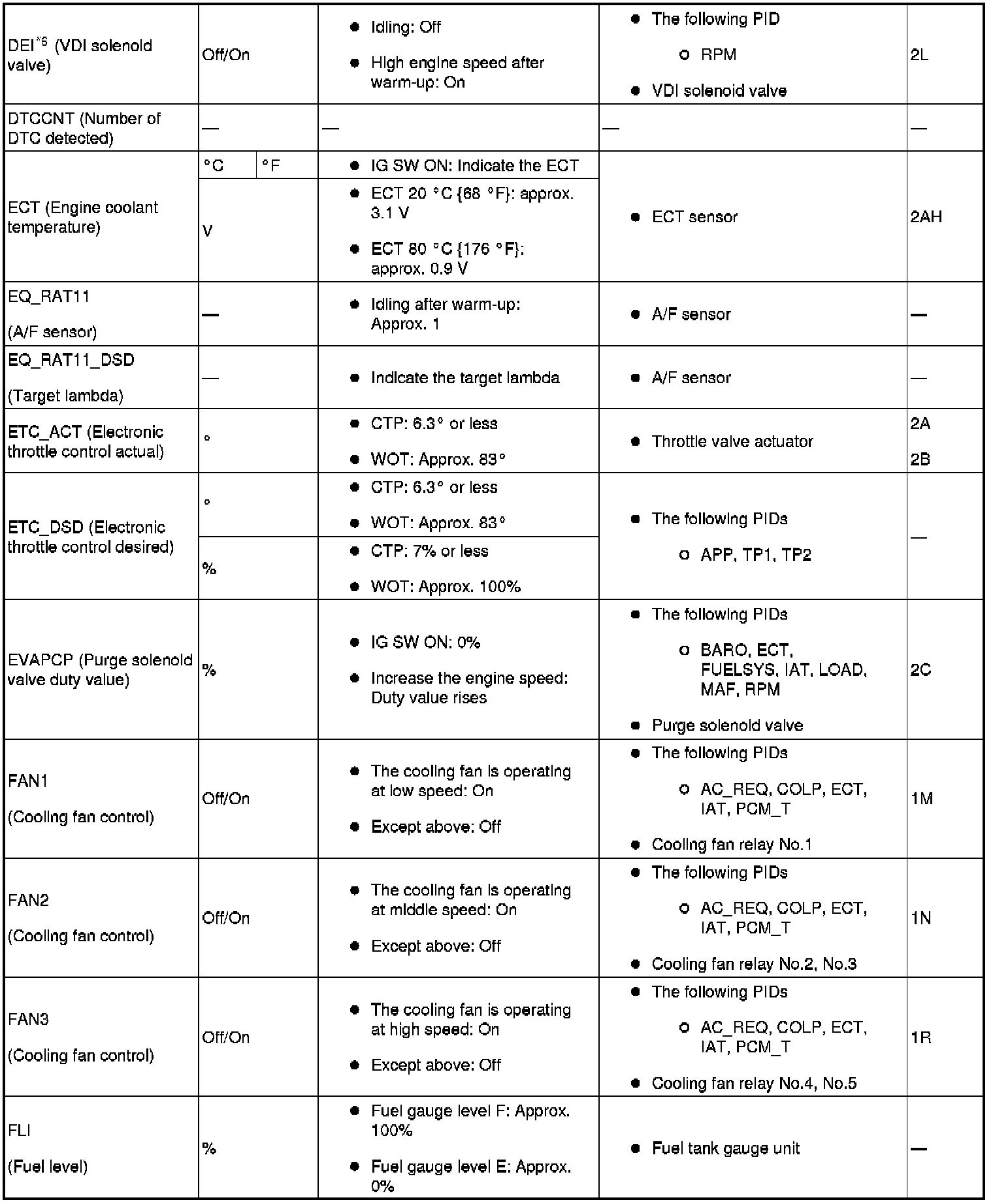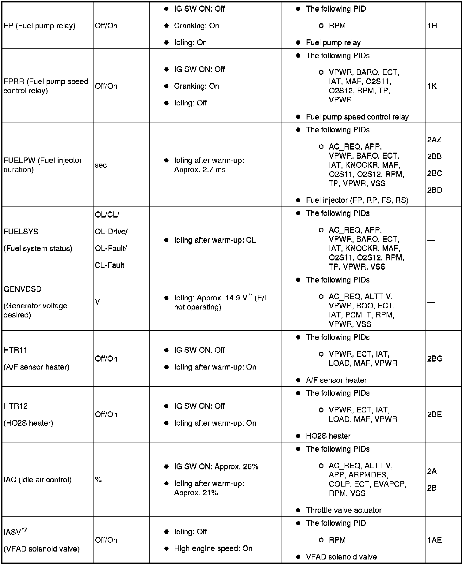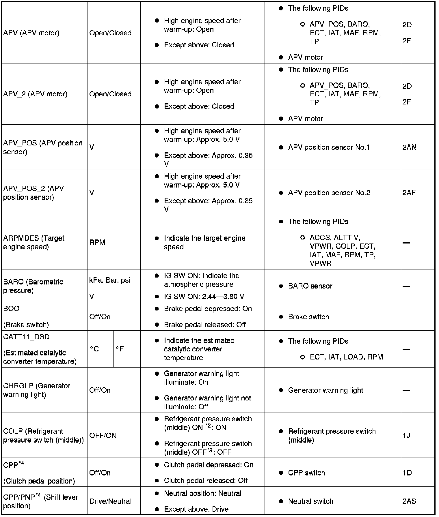 Home >> Mazda >> 2009 >> RX8 2RTR-1.3L >> Repair and Diagnosis >> Powertrain Management >> Computers and Control Systems >> Engine Control Module >> Testing and Inspection >> Pinout Values and Diagnostic Parameters >> PID/DATA Monitor Table