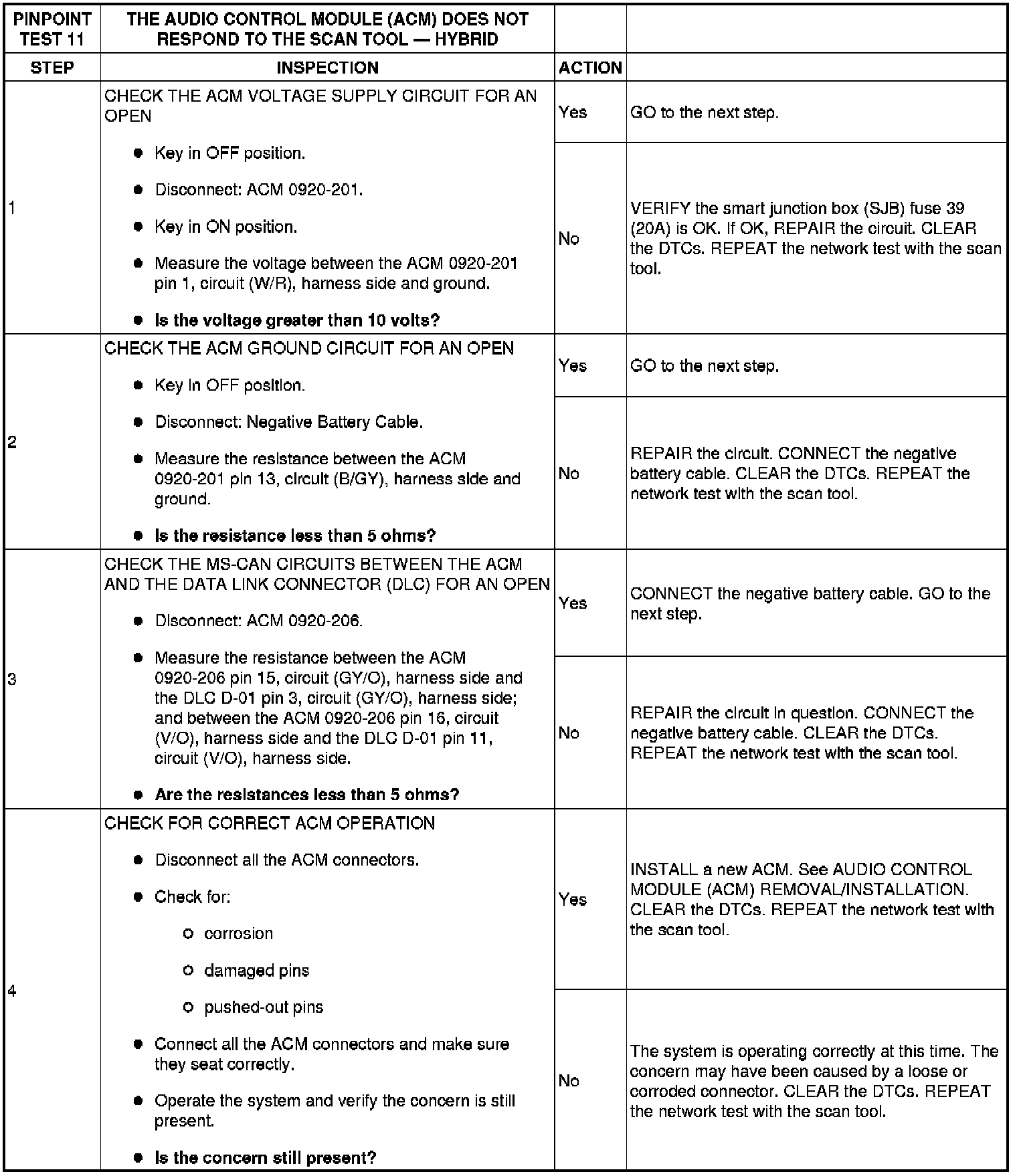 PINPOINT TEST 11: THE AUDIO CONTROL MODULE (ACM) DOES NOT RESPOND TO THE SCAN TOOL - HYBRID