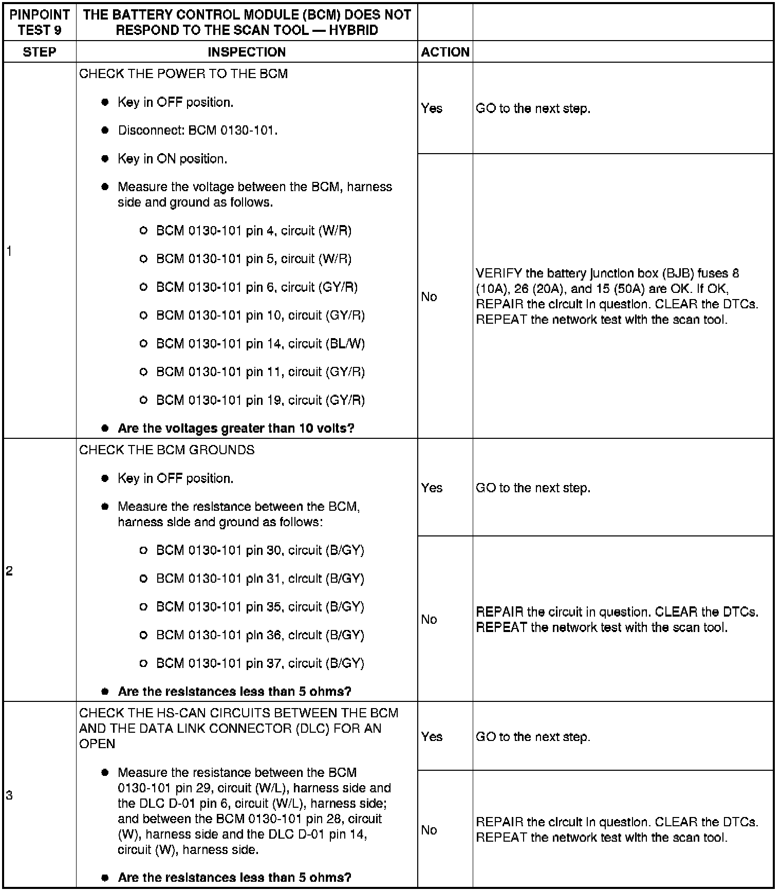Home >> Mazda >> 2009 >> Tribute 2WD L4-2.5L Hybrid >> Repair and Diagnosis >> Powertrain Management >> Computers and Control Systems >> Testing and Inspection >> Pinpoint Tests >> CAN Communication Network >> Pinpoint Test 9: The Battery Control Module (BCM) Does Not Respond To The Scan Tool