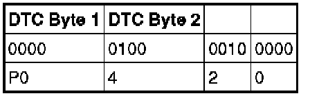 Like all digital signals, DTCs are sent to the scan tool as a series of 1s and 0s. Each DTC is made up of 2 data-bytes which each consist of 8 bits that can be set to 1 or 0. The data is decoded by the scan tool to display each set of 4 bits as a hexadecimal number (0 to F) in order to display the DTCs in the conventional format. For example, P0420 Catalyst System Efficiency Below Threshold (Bank 1).
