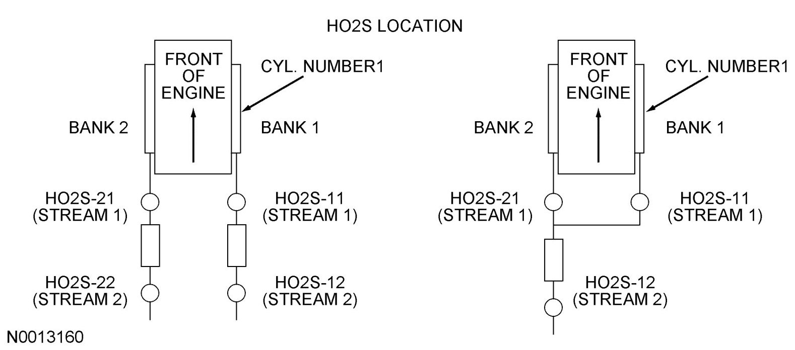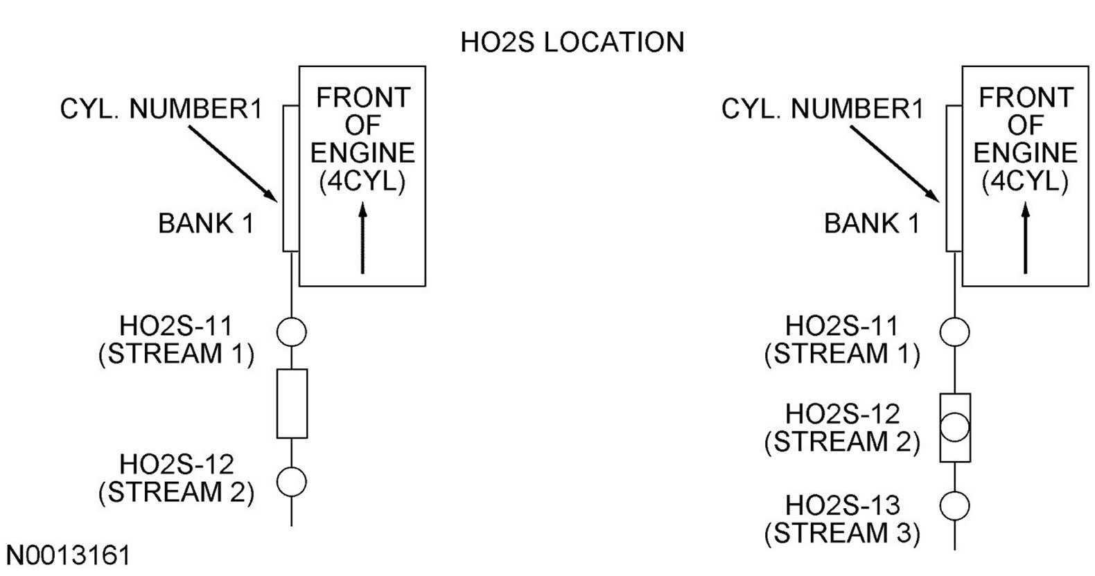 The number of HO2Ss used in the exhaust stream and the location of these sensors depend on the vehicle emission certification level (LEV, LEV-II, ULEV, PZEV). On most vehicles only 2 HO2Ss are used in an exhaust stream. The front sensors (HO2S11/HO2S21) before the catalyst are used for primary fuel control while the ones after the catalyst (HO2S12/HO2S22) are used to monitor catalyst efficiency. However, some partial zero emission vehicles (PZEV) use 3 HO2Ss for each engine bank. The stream 1 sensors (HO2S11/HO2S21) located before the catalyst are used for primary fuel control, the stream 2 sensors (HO2S12/HO2S22) are used to monitor the light-off catalyst, and the stream 3 sensors (HO2S13/HO2S23) located after the catalyst are used for long term fuel trim control to optimize catalyst efficiency (fore aft oxygen sensor control). Current PZEV vehicles use only a 4-cylinder engine, so only the bank 1 HO2Ss are used.