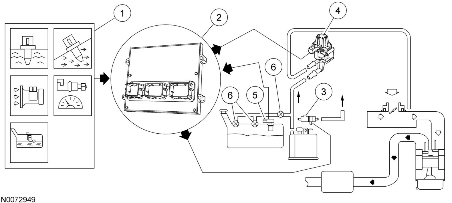 The enhanced EVAP system consists of a fuel tank, fuel filler cap, fuel tank mounted or in-line fuel vapor control valve, fuel vapor vent valve, EVAP canister, fuel tank mounted or fuel pump mounted or in-line fuel tank pressure (FTP) sensor, EVAP canister purge valve or vapor management valve (VMV), intake manifold hose assembly, EVAP canister vent (CV) solenoid, PCM and connecting wires, and fuel vapor hoses.