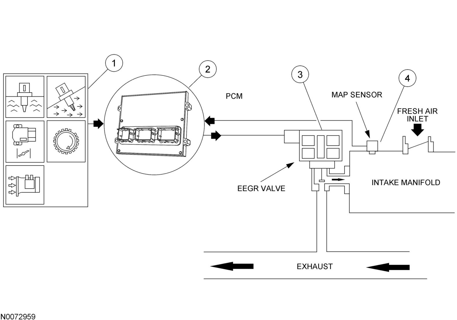 The EEGR system consists of an electric motor/EGR valve integrated assembly, a PCM, and connecting wiring. Additionally a manifold absolute pressure (MAP) sensor is also required. Operation of the system is as follows: