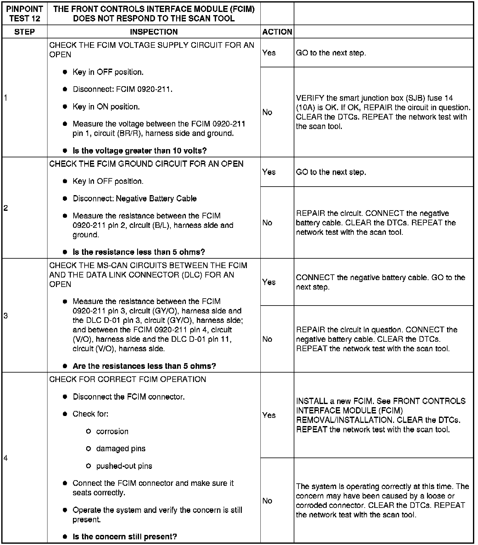 PINPOINT TEST 12: THE FRONT CONTROLS INTERFACE MODULE (FCIM) DOES NOT RESPOND TO THE SCAN TOOL