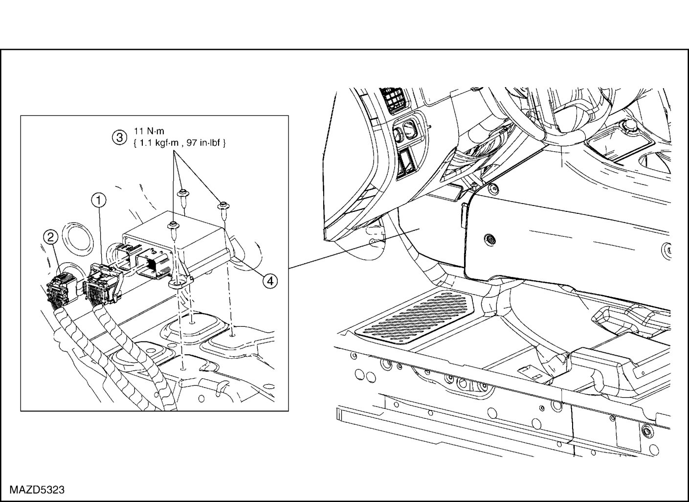 - Tighten to 11 Nm {1.1 kgf-m, 97 in-lbf}.