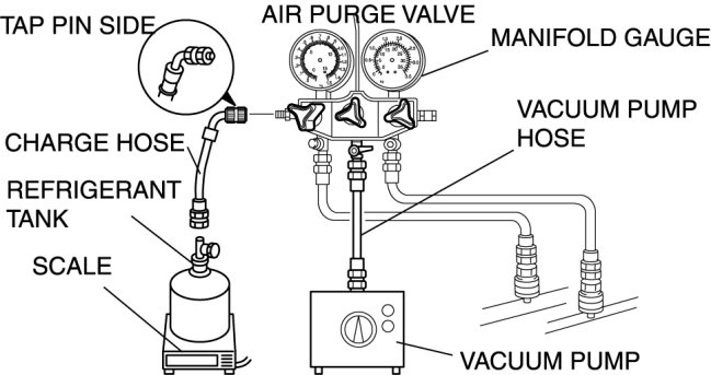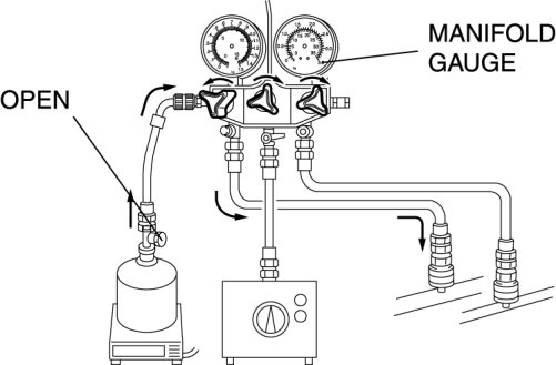 - Close the manifold gauge valve immediately after stopping the vacuum pump. If the valve is left open, the vacuum pump oil will back flow into the refrigeration cycle and cause a decrease in the efficiency of the air conditioner.