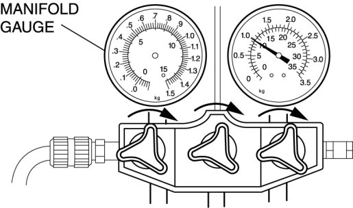 4. When the high-pressure side reading increases to 0.098 MPa {1.0 kgf/cm2, 14 psi}, close the low-pressure side valve of the manifold gauge.