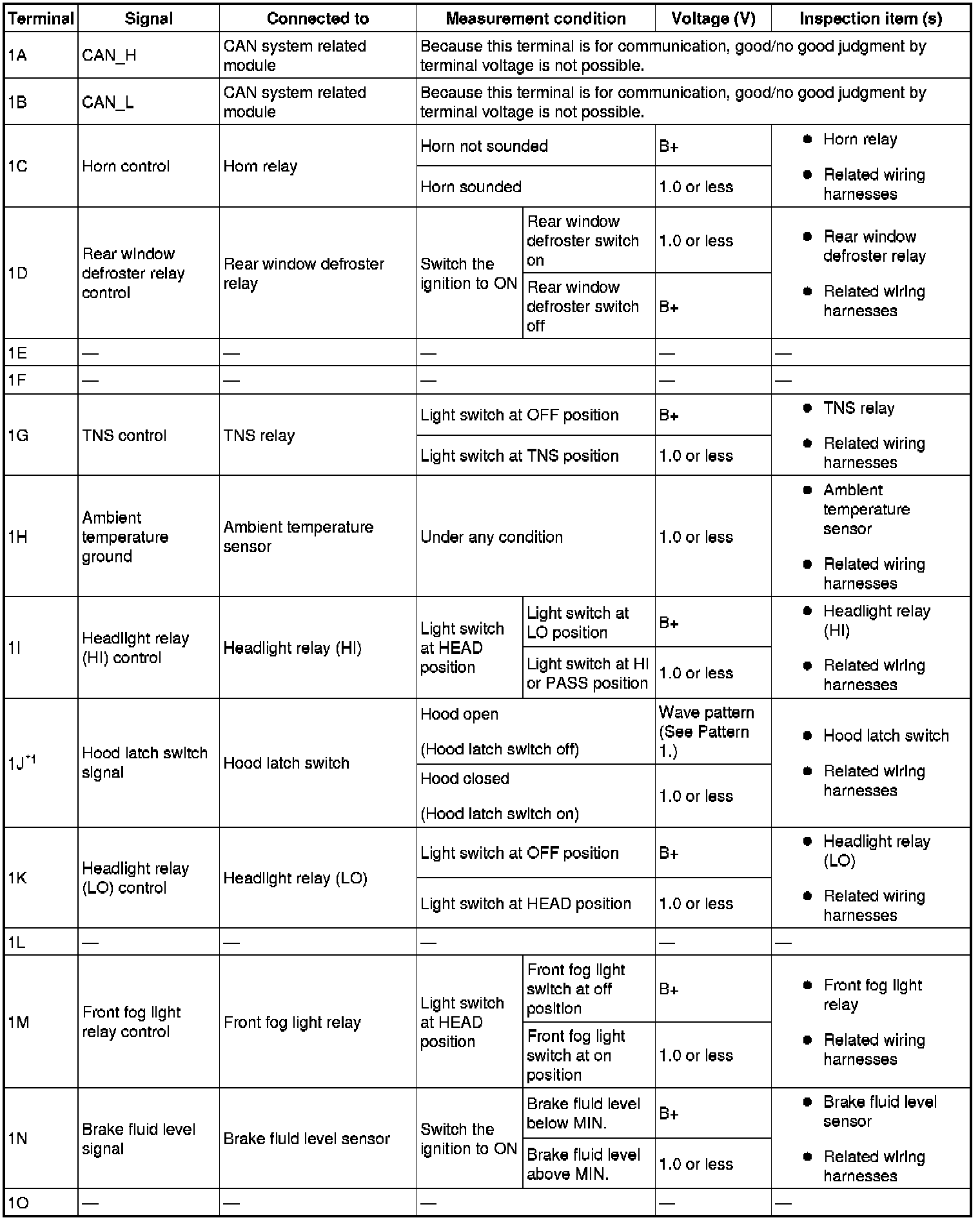 - If the voltage or continuity is not as specified in the Terminal Voltage Table, inspect the parts under "Inspection item (s)".