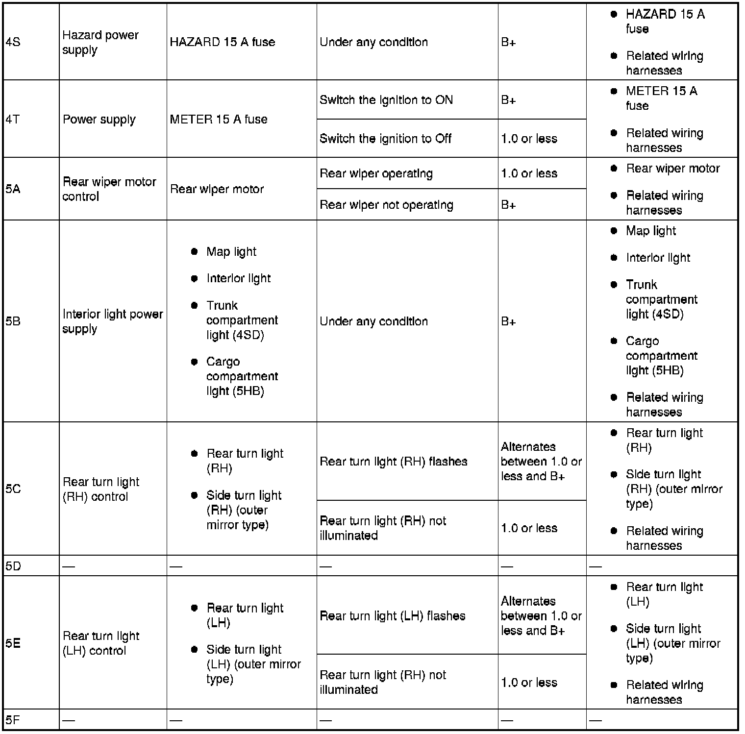 - Rear door switch (LH) signal: 6E (+) and body ground (-)