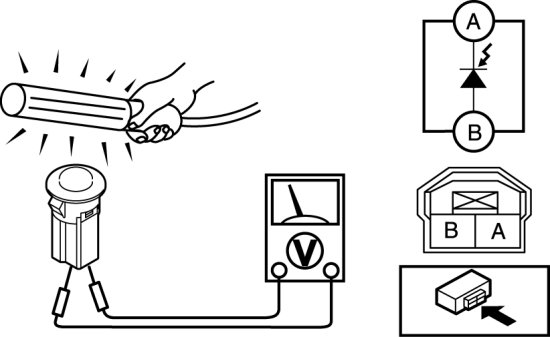 2. Using a tester, connect the positive (+) lead to solar radiation sensor terminal A, the negative (-) lead to terminal B, and verify that a voltage value is output.