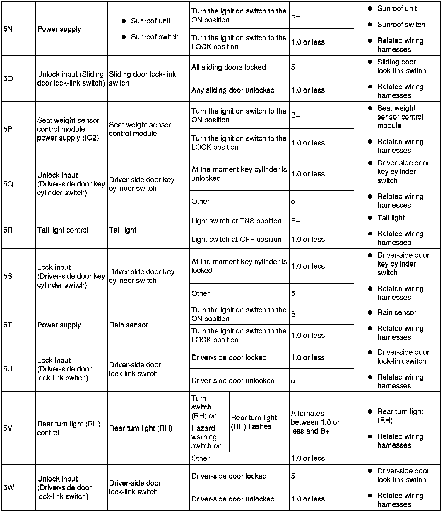 - If the voltage or continuity is not as specified in the Terminal Voltage Table (Reference), inspect the parts under "Inspection item (s)".