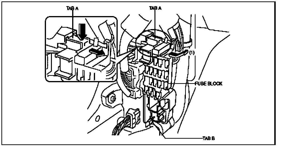 4. Remove tab A as shown in the figure,pull the fuse block in the direction of the arrow (1), and remove tab B.