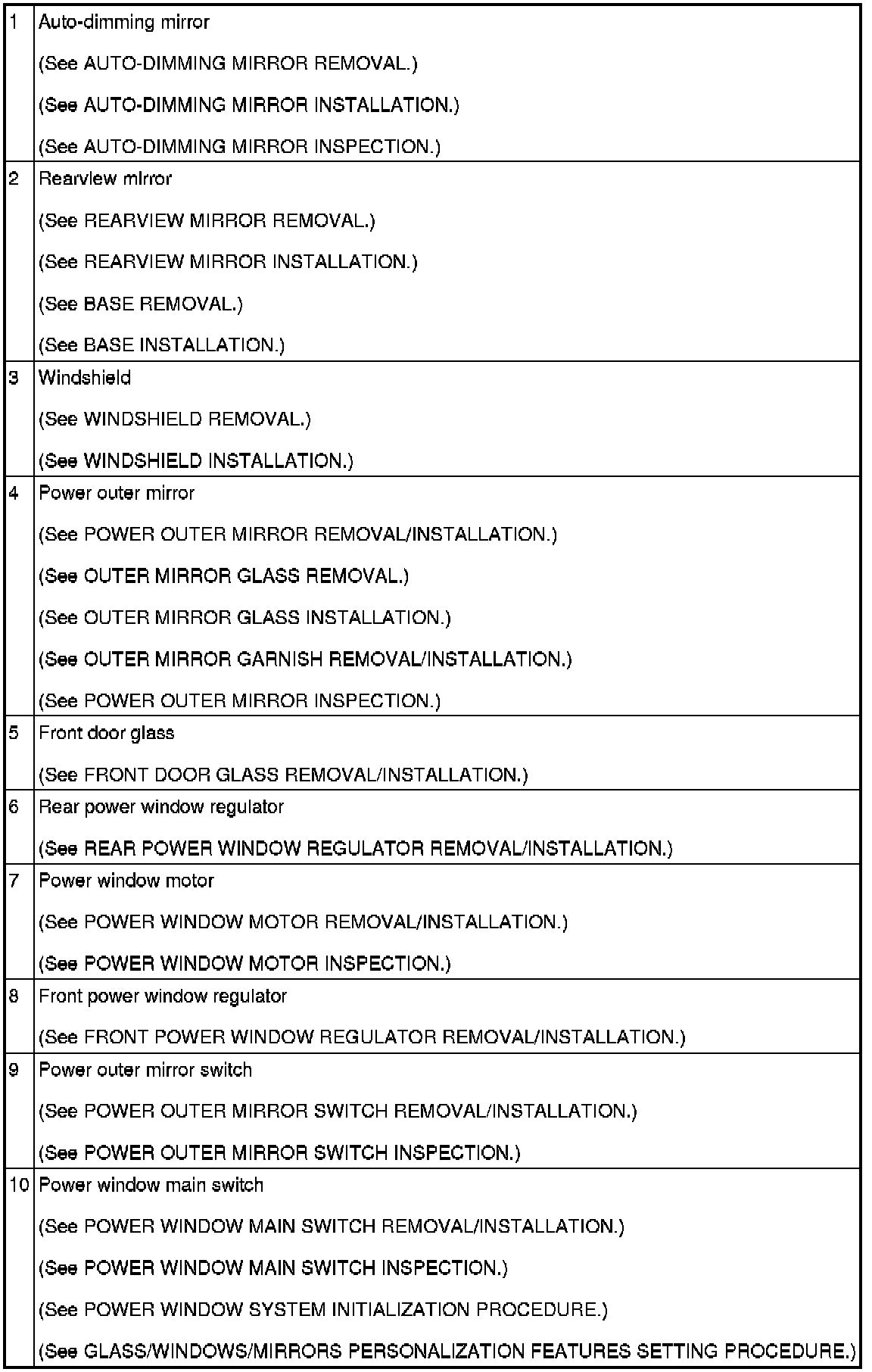 GLASS/WINDOWS/MIRRORS LOCATION INDEX