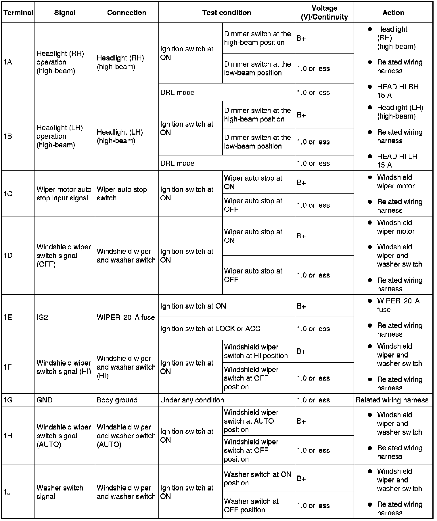 3. Measure the voltage at the auto light/wiper control module terminals as indicated below.