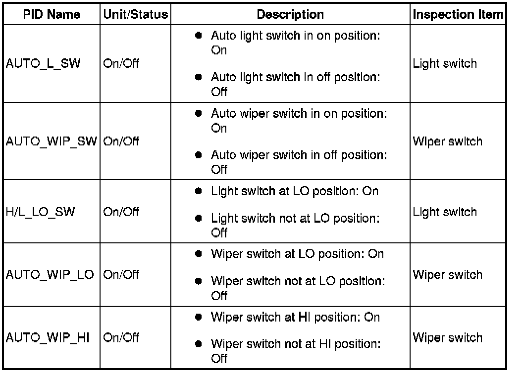 PID/Data Monitor Table - Auto Light/Wiper Control Module
