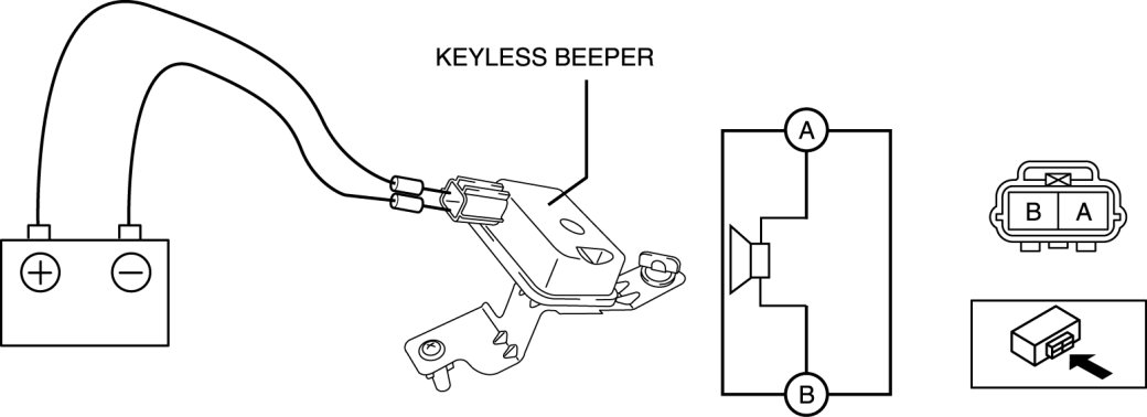 4. When applying battery positive voltage to the keyless beeper, verify that an electromagnetic sound is heard.