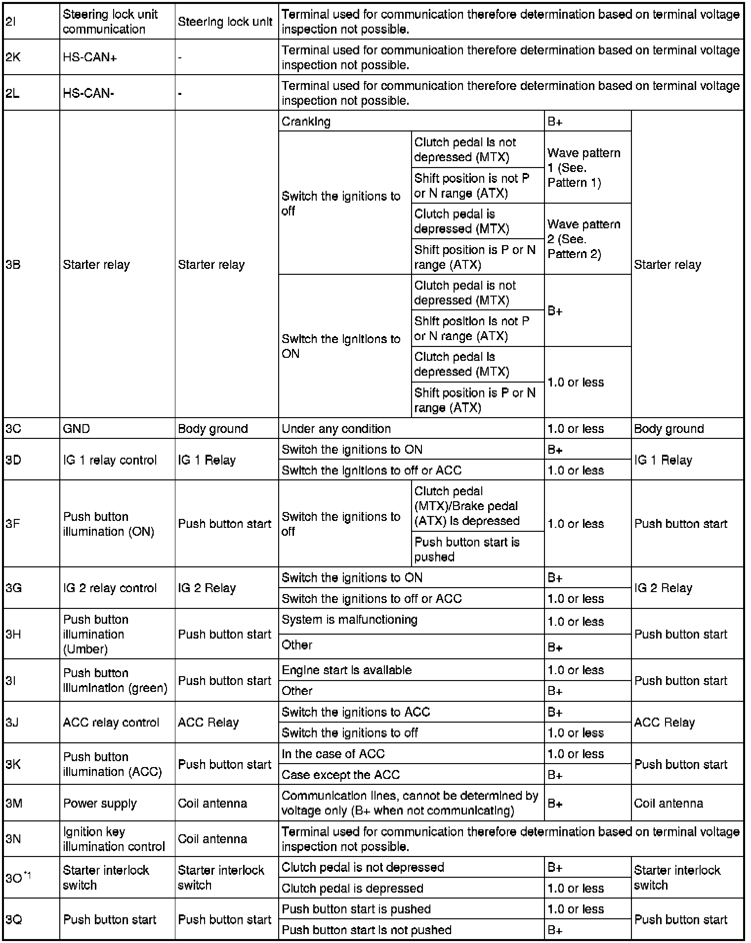 - Starter relay: 3B (+) and body ground (-)