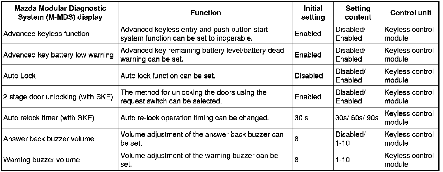 Home >> Mazda >> 2010 >> Mazdaspeed3 L4-2.3L Turbo >> Repair and Diagnosis >> Body and Frame >> Locks >> Keyless Entry >> Testing and Inspection >> Programming and Relearning >> Personalization Features Setting Procedure