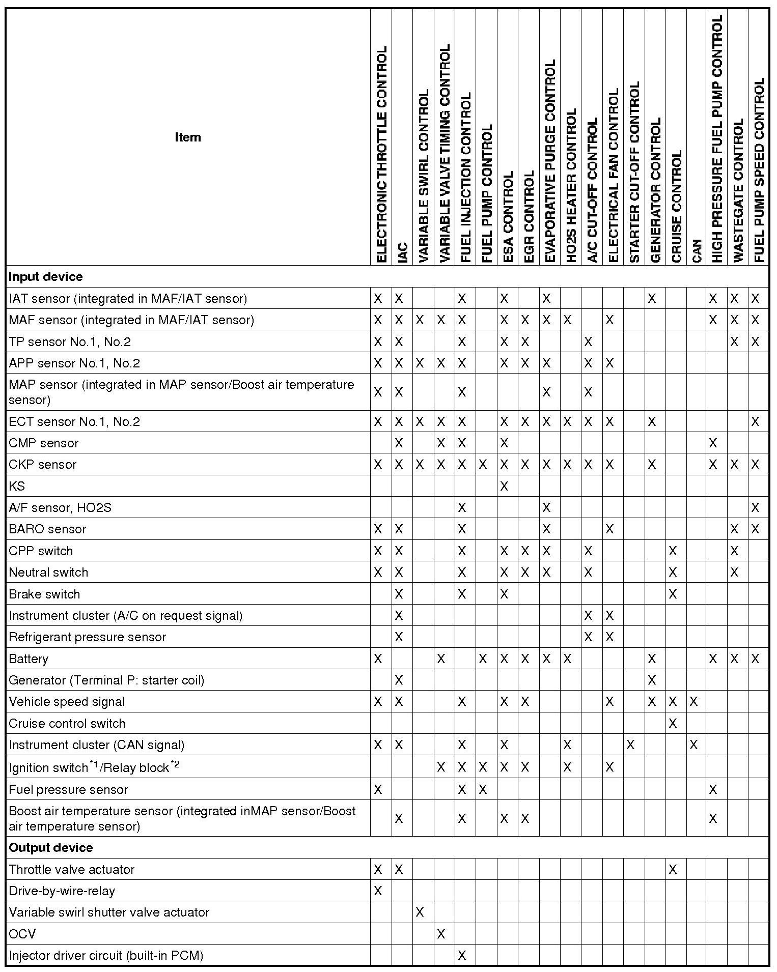 Home >> Mazda >> 2010 >> Mazdaspeed3 L4-2.3L Turbo >> Repair and Diagnosis >> Powertrain Management >> Computers and Control Systems >> Description and Operation >> Control System Device And Control Relationship Chart