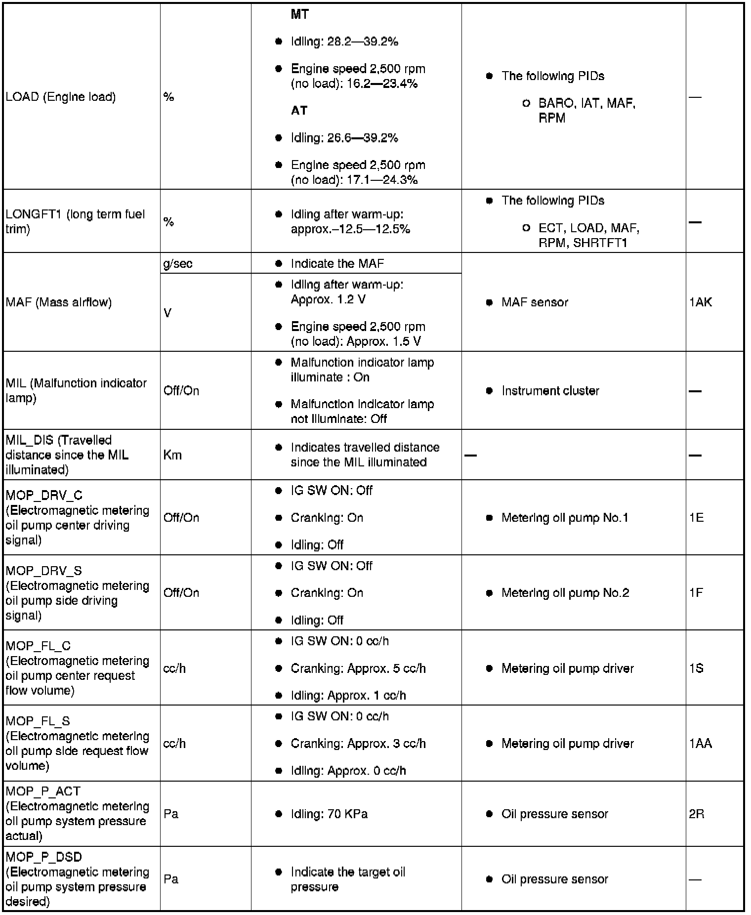PID/DATA monitor table (reference)