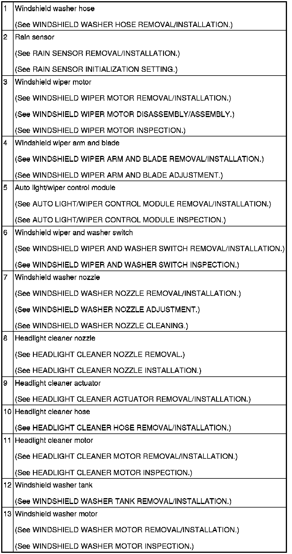 WIPER/WASHER SYSTEM LOCATION INDEX