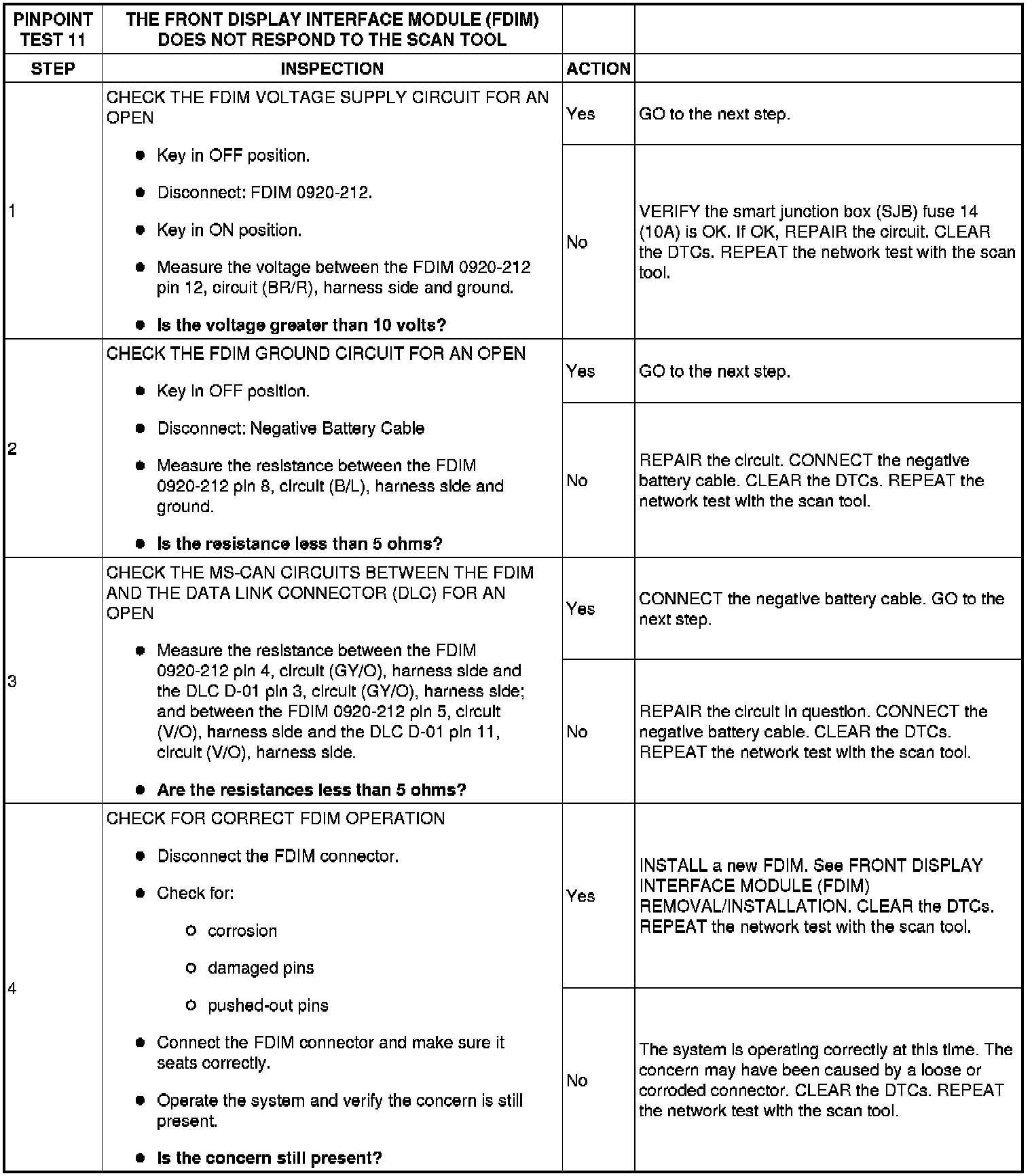 Pinpoint Test 11: The Front Display Interface Module (FDIM) Does Not Respond To The Scan Tool