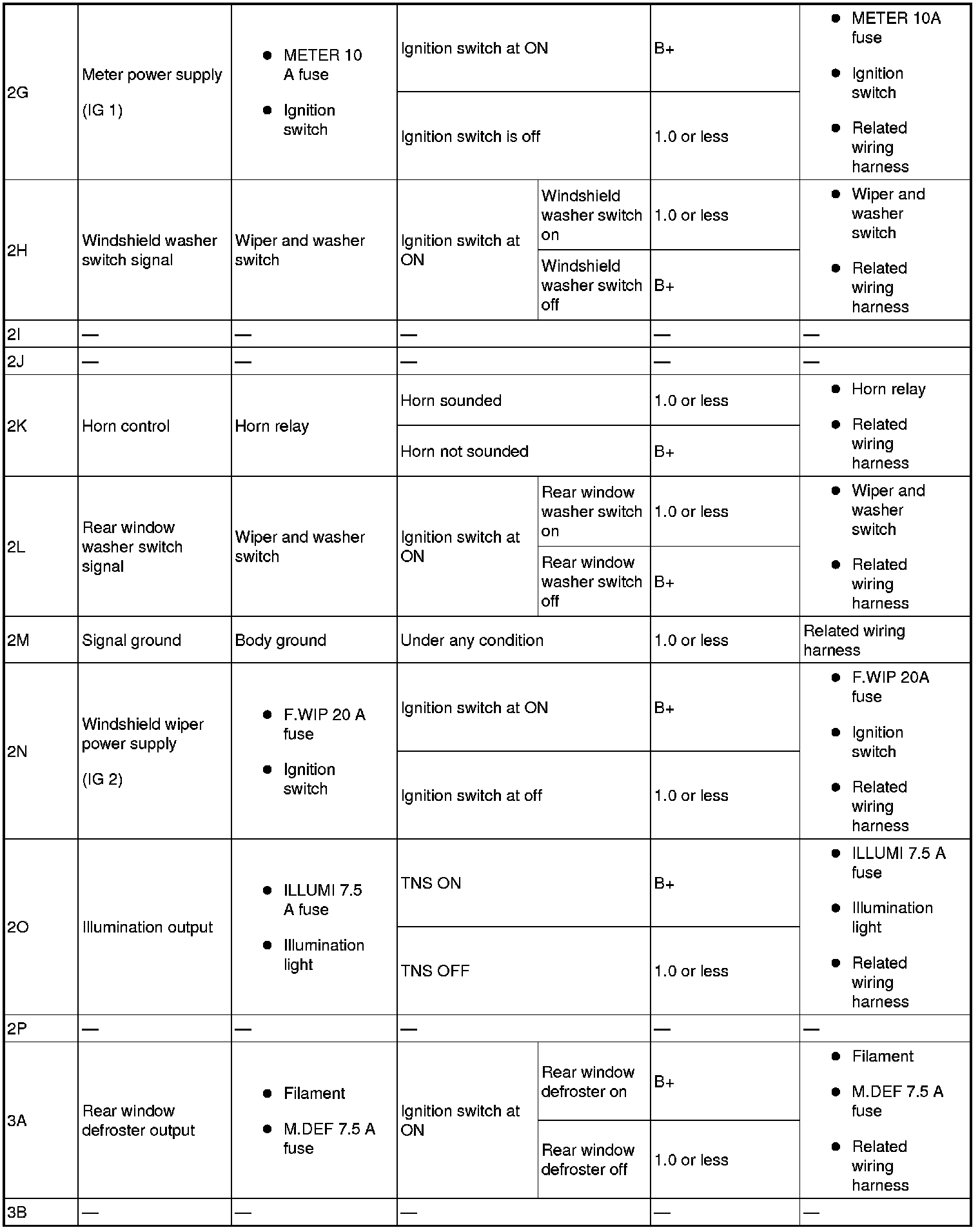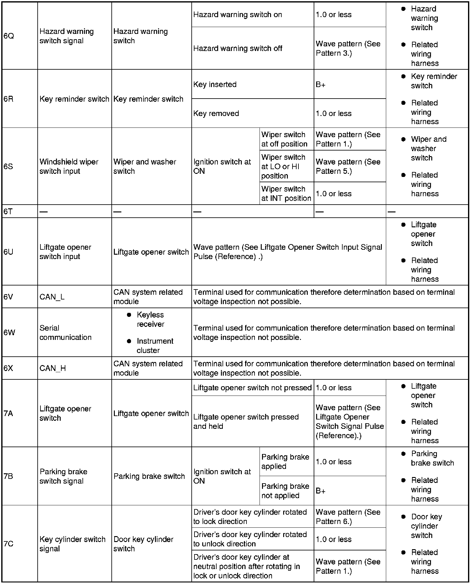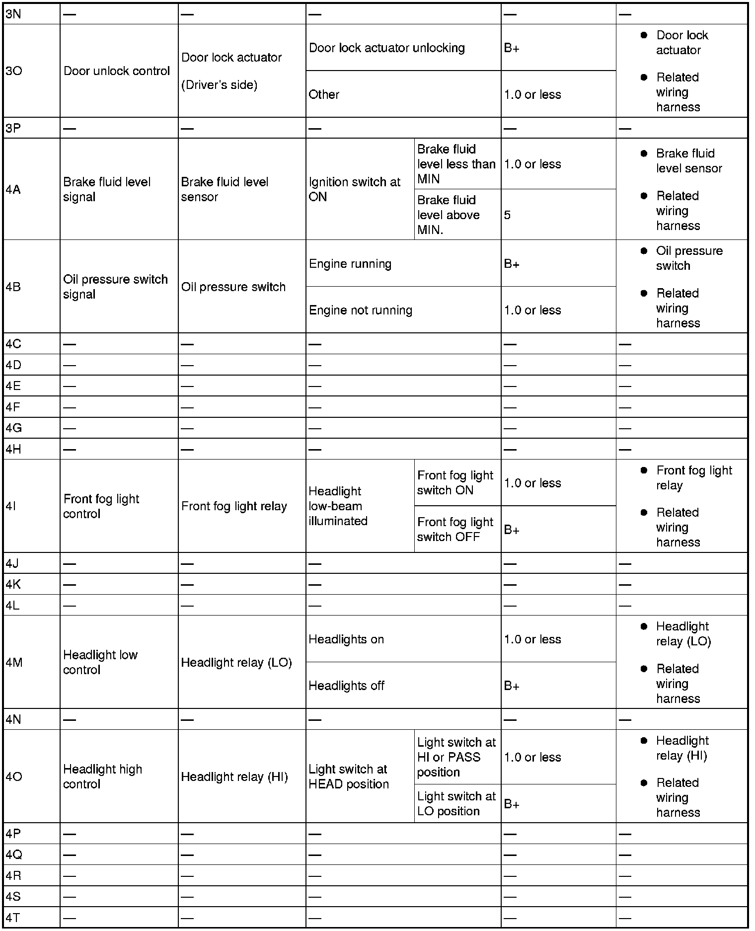 - If the voltage or continuity is not as specified in the Terminal Voltage Table (Reference), inspect the parts under "Inspection item (s)".