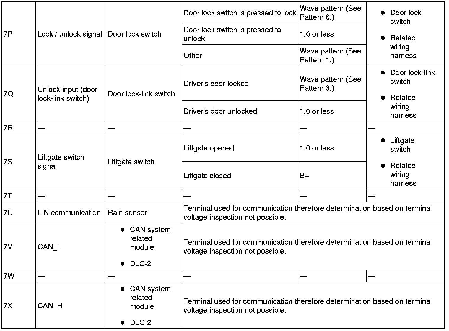 - Lock input (door lock-link switch): 7L (+) -> body ground (-)