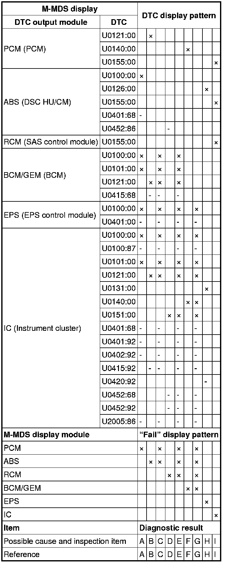 - A hyphen (-) in the DTC output pattern table indicates that the DTC may be displayed depending on the malfunction detection conditions. If only an (x) is indicated, it means the DTC will not be displayed.