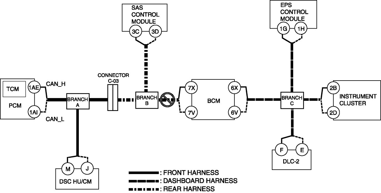 - Wiring harness between DSC HU/CM terminal J and branch A