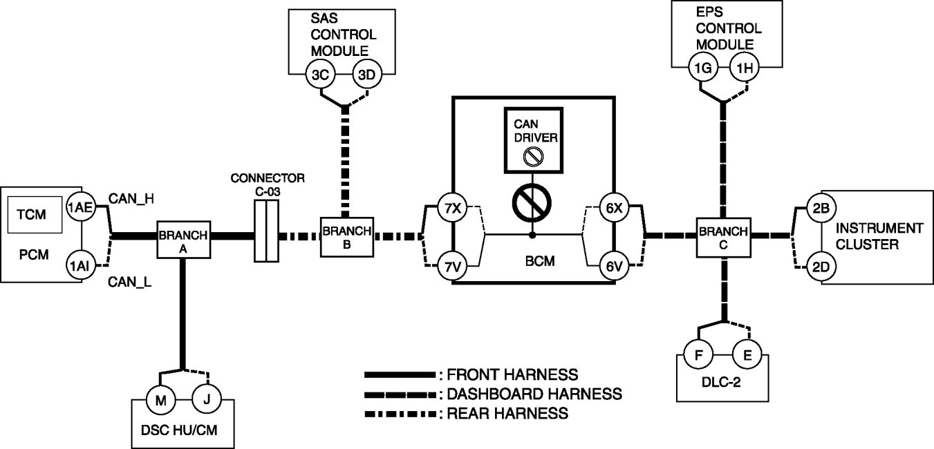 - Wiring harness between BCM terminal 6X and branch C