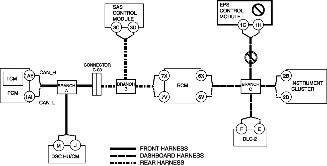 - Wiring harness between EPS control module terminal 1H and branch C