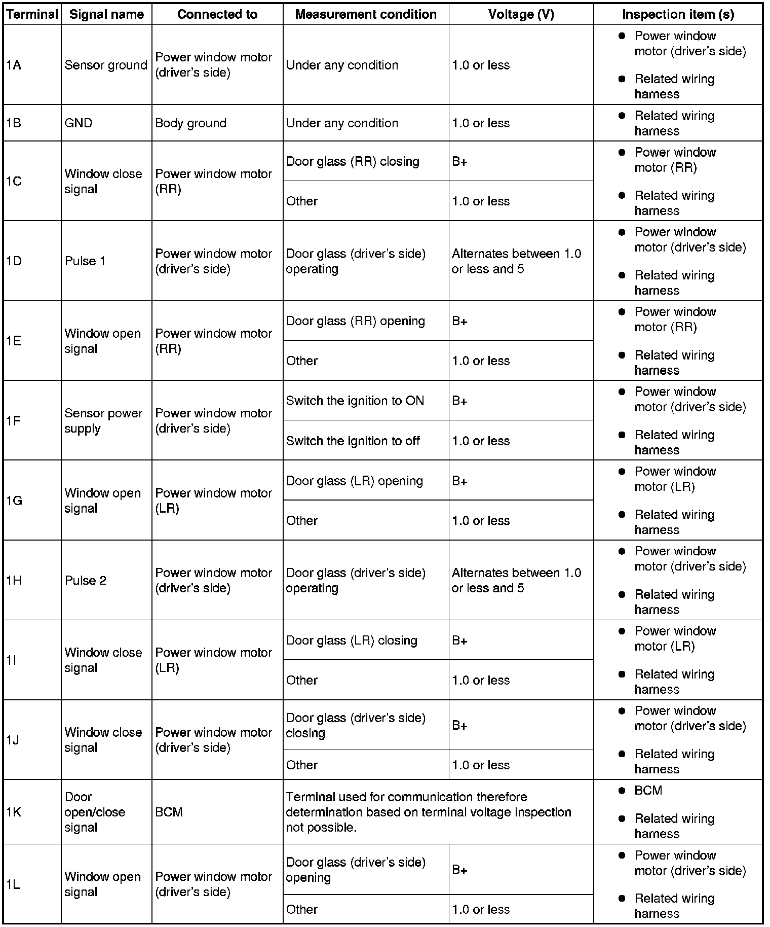 - If the voltage is not as specified in the terminal voltage table, inspect the parts under Inspection item(s) and related wiring harnesses.