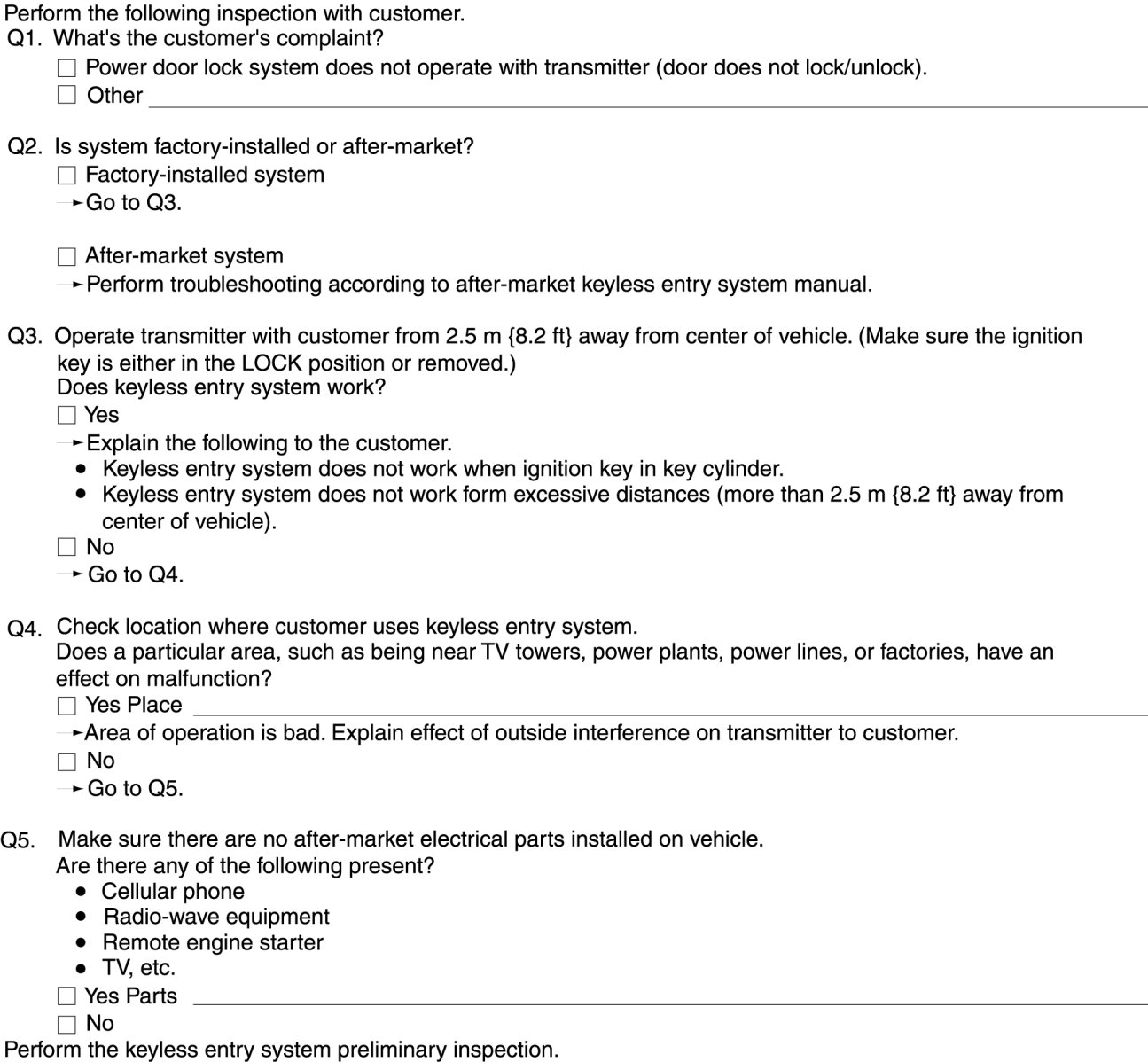- If the symptom is "Power door lock system does not operate with transmitter at all," find out how the customer uses the keyless entry system by following the check sheet below.