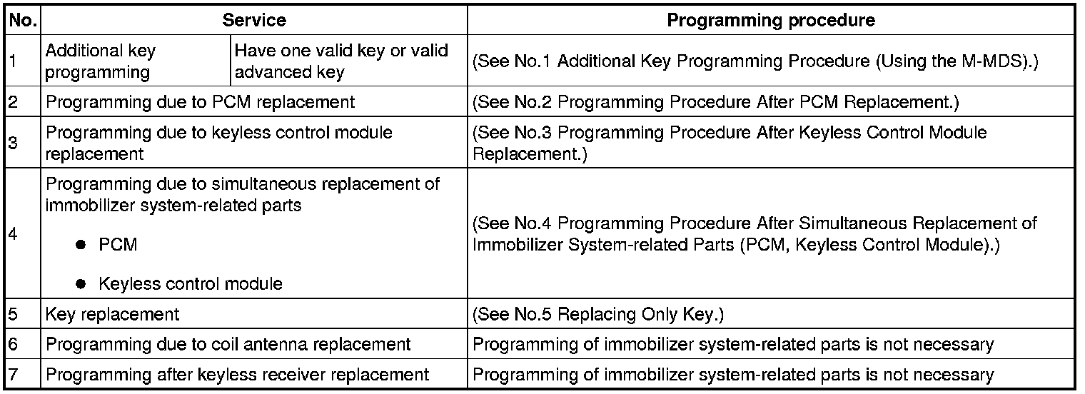 Immobilizer System-Related Parts Service and Programming Procedure Table