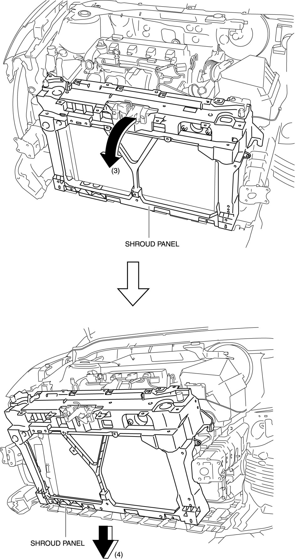 6. Pull the shroud panel in the direction of arrow (3) in the figure, and remove it in the direction of arrow (4).